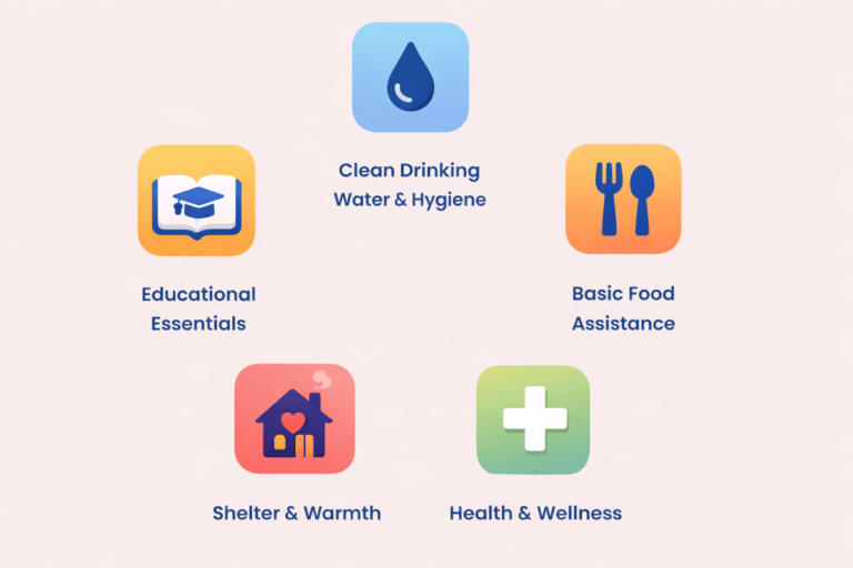 Clean water and hygiene programs provide water filters, soap, and sanitizers to improve health and prevent disease. Healthcare services include medical checkups, preventative care, and wellness programs designed to support children’s physical and emotional heartbeats as they grow.